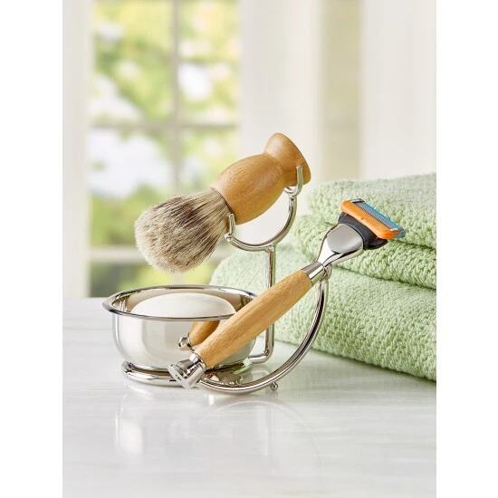 This shaving kit is handsomely styled in chrome-plated stainless steel and real bamboo. It includes a refillable razor that holds a Gillette Fusion Bladeยฎ, which not only ensures a clean, close shave but it also makes this razor a sustainable upgrade to standard disposable razors. The set also includes a natural bristle shave brush made of springy silvertip badger bristles. Silvertip badger bristles are soft and pliable and create a richer, thicker lather. The gift set also includes a shave bowl, shaving soap, and a stand.